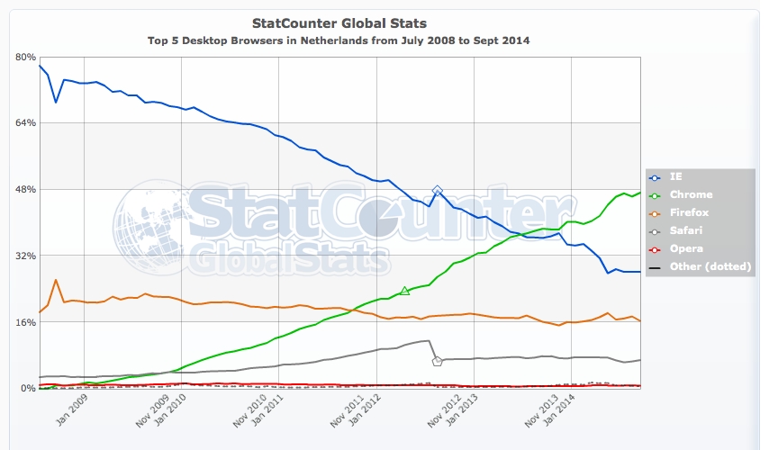 Waar Internet Explorer rond 2004 nog een marktaandeel van ruim 95% had is dat met de komst van Firefox (2004) en Google Chrome (2008) wel veranderd, zoals het grafiekje van StatCounter mooi laat zien (klik voor groter):
