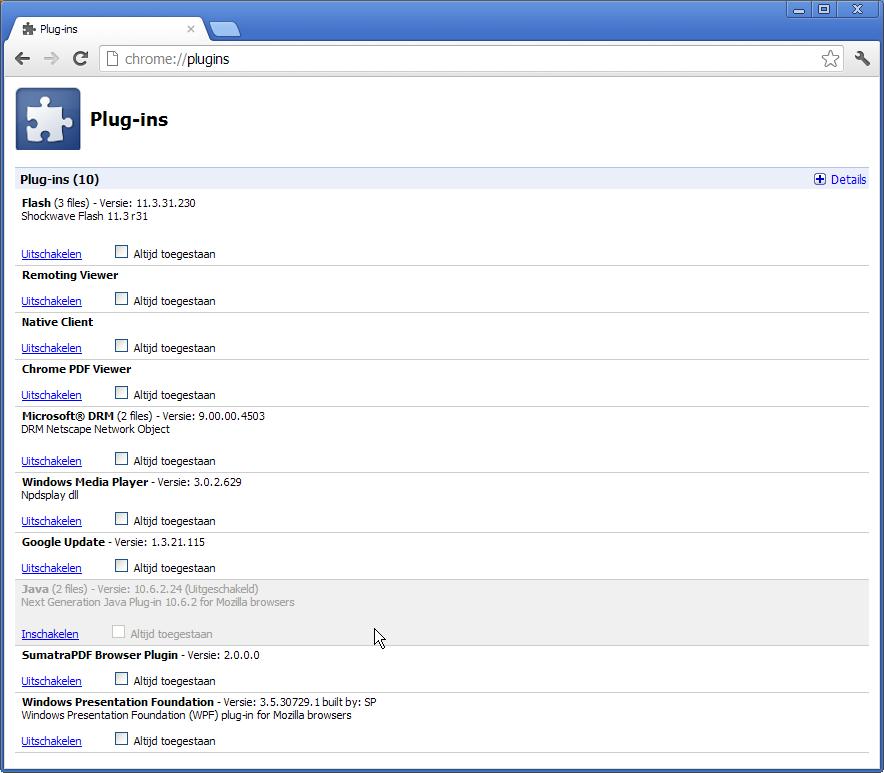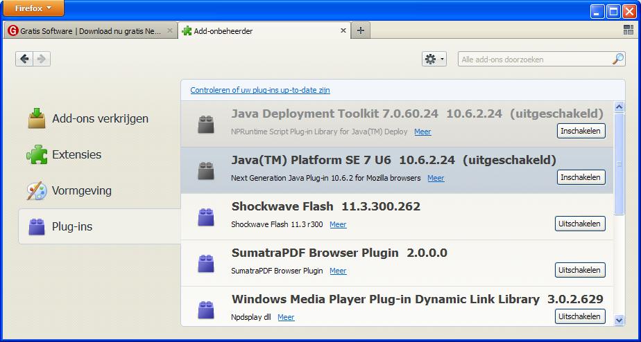 Die Java Plug-in 10.6.2 heb ik voor alle zekerheid ook meteen uitgeschakeld aangezien dit niet gebeurd na het uitschakelen van die andere twee: