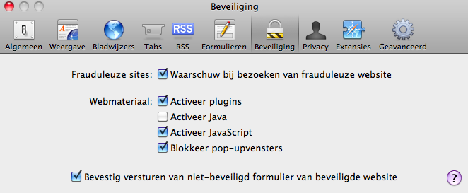 1. Ga naar menu Safari | Voorkeuren | tabblad Beveiliging