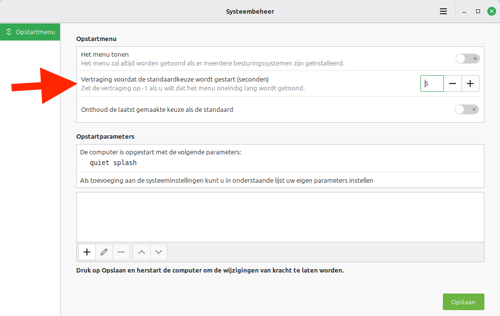 En als je niet zo snel bent, dan? Is er in Mint ook een instelling te wijzigen waardoor je opnieuw en in een bootmenu kunt opstarten? Want dat is mijn vraag.