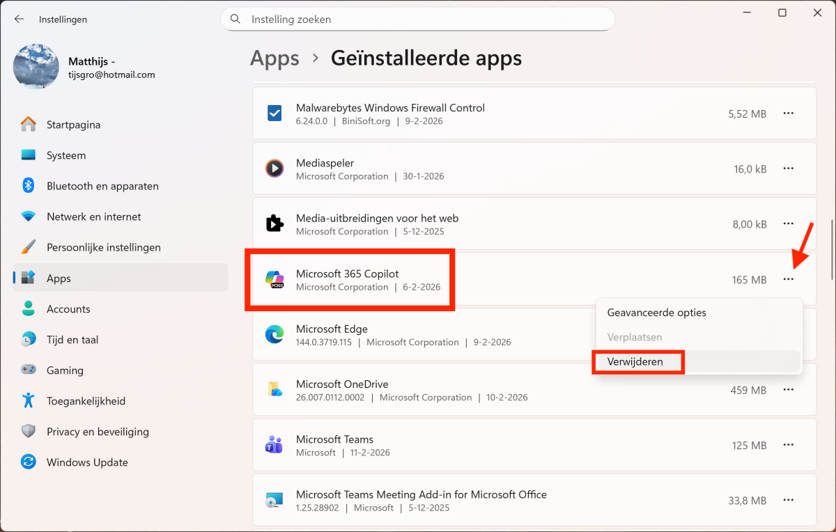 a) Ga in Windows 11 naar Instellingen | Apps en klik op de drie puntjes ... achter Copilot en kies voor Verwijderen