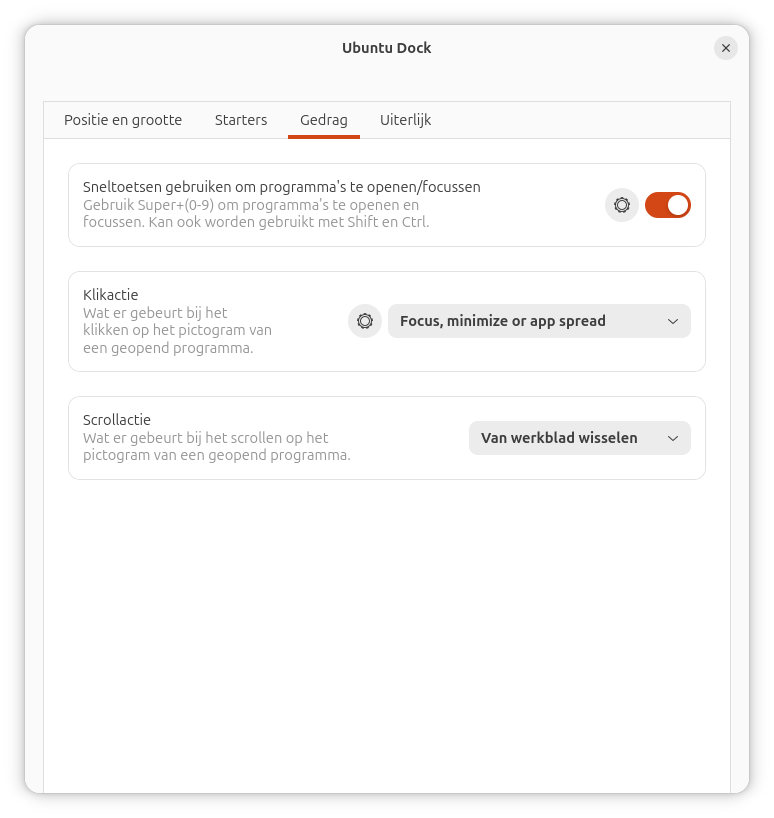 3. Bedoel je minimaliseren door klik op programma-icoon? Dit kun je makkelijk instellen als je de Uitbreidingen-app (Extensions) van Gnome hebt geInstalleerd. Open UItbreidingen-app, ga naar Ubuntu Dokc en klik op drie puntjes en dan Instellingen. Ga vervolgens naar tabblad Gedrag en kies achter Klikactie voor iets met Minimaliseren of Minimize. Werkt prima hier.