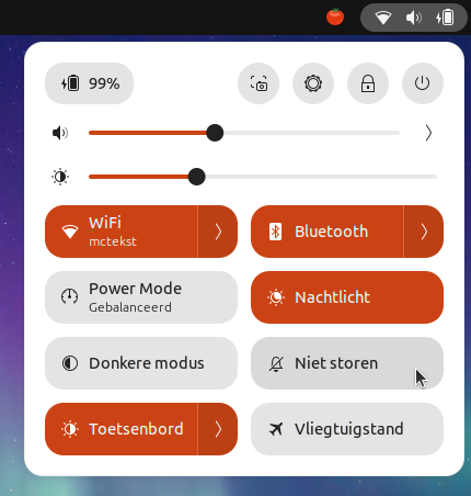 Het snelle instellingen-menu rechtsboven (klik op de icoontjes voor wifi, geluid etc.) heeft een nieuwe een Niet storen-knop om meldingen op stil te zetten. Dit naast de snelle instellingen voor WiFi, Bluetooth, Energie modus, Nachtlicht, Donkere modus, Toetsenbordverlichting (als je die hebt op je laptop), Vliegtuigstand, de schuifbalken voor geluid en schermhelderheid en kleine knoppen voor batterij, schermafbeelding maken, instellingen en uitloggen/herstarten/afsluiten.