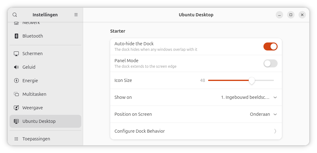 De afbeelding helemaal boven aan dit artikel is een met een paar klikken aangepast bureaublad van Ubuntu 26.04. Klik rechts op het bureaublad en kies Achtergrond aanpassen voor een andere afbeelding. En ga naar Instellingen | Ubuntu Desktop en zet Panel Mode uit bij Starter en kies voor Onderaan bij Position on Screen.