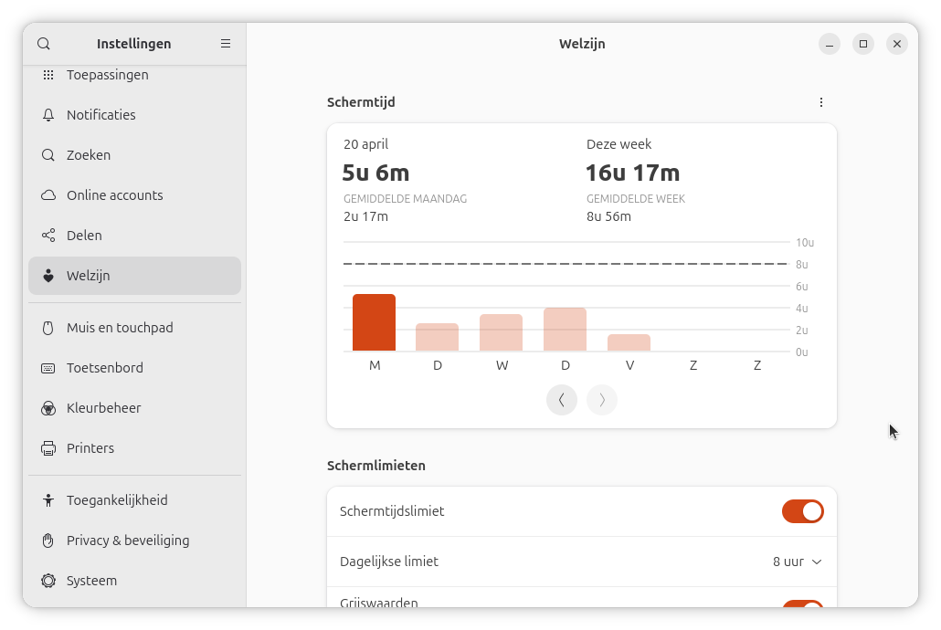 Ook de Gnome desktopomgeving in Ubuntu heeft nu een methode om je schermtijd bij te houden en te begrenzen. Ga naar de Instellingen-app | Welzijn en je kunt schermtijd bijhouden en daarna limieten instellen. Ook kun je pauzes (bewegen en zicht) instellen.