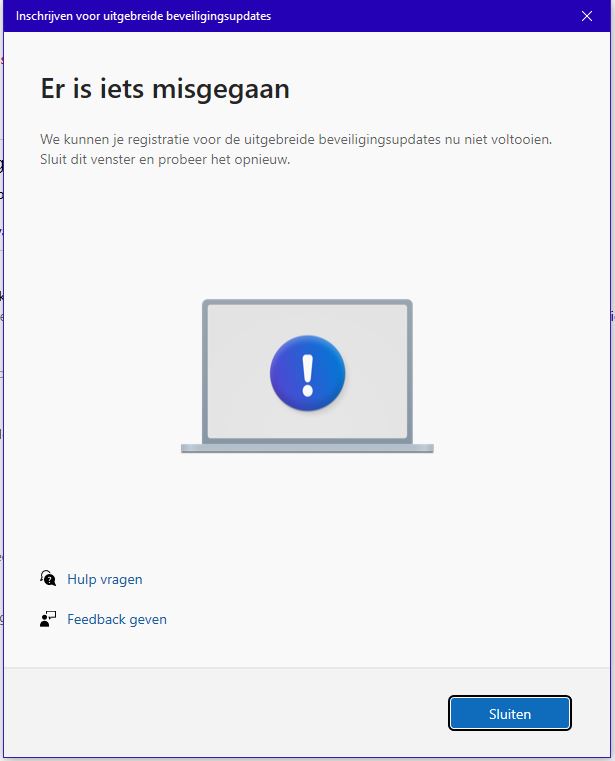 Nadat ik mij in oktober -met Microsoft account- had ingeschreven voor een jaar langer Windows 10 updates, zag ik vandaag: "Op uw apparaat ontbreken belangrijke beveiligings-en kwaliteitsfixes". "Schrijf u in".