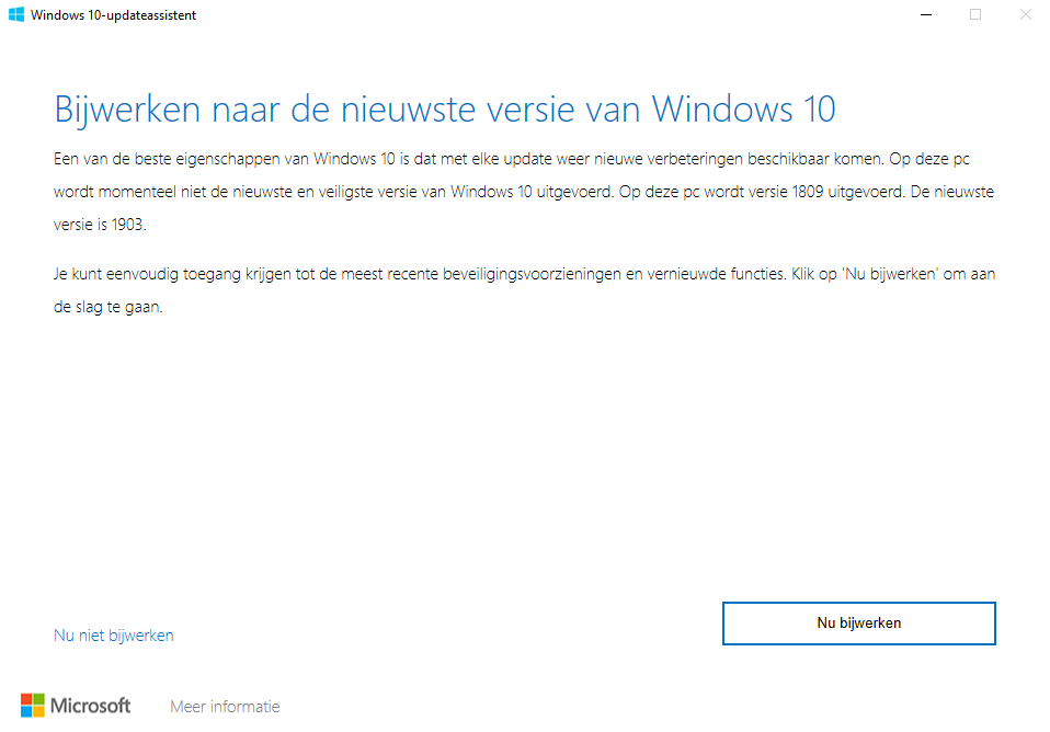 Ik wacht mooi nog even, totdat Microsoft versie 1903 zelf bij mij aanbiedt. Heb nog lang die versie niet. Draai nog op versie 1803. Ik ga niks (!) zelf installeren. Ben blij dat mijn spul goed draait! Eerst eens kijken waar ze eind mei mee gaan komen...