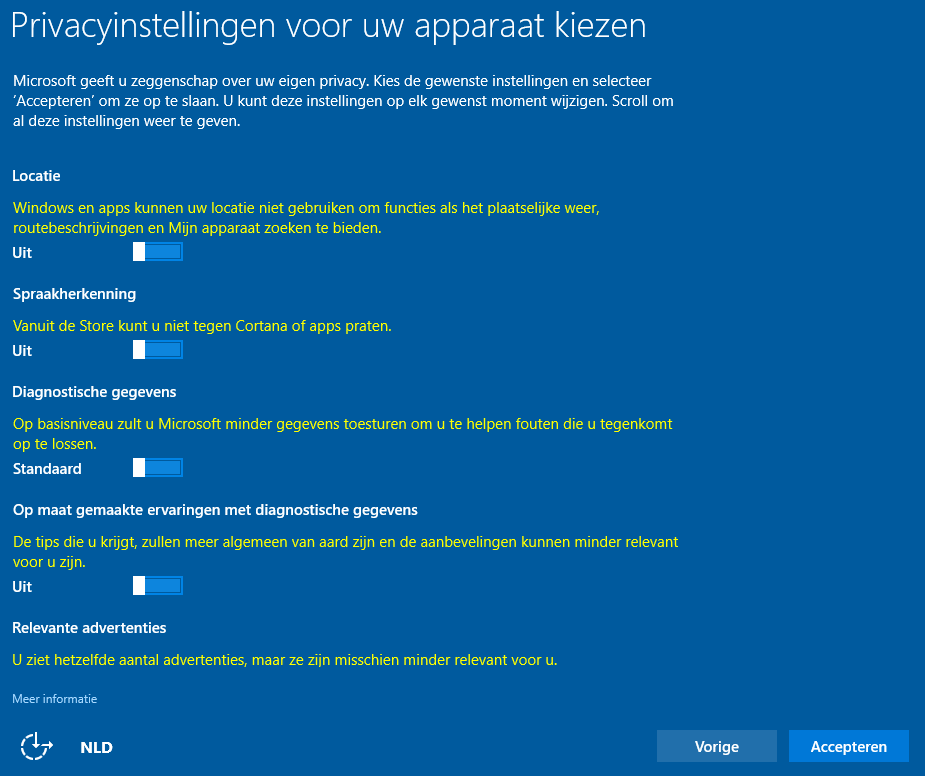 Let op dat je bij de installatie van de Creators Update de nieuwe privacy-instellingen van Windows 10 1703 goed bekijkt en desgewenst wat schakelaars op Uit zet. Let ook op dat je even naar beneden moet scrollen in het venster om alle privacyinstellingen te zien!