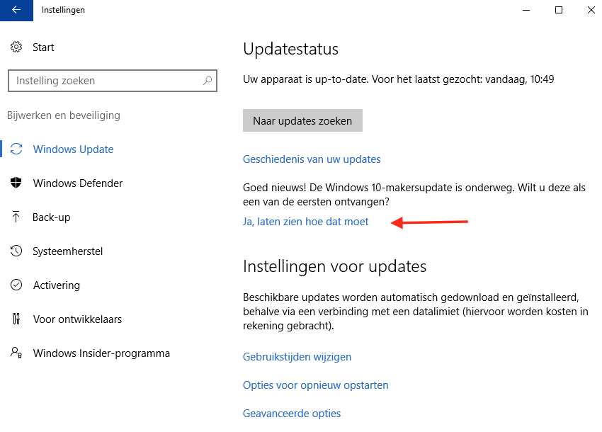 Bij Instellingen, Bijwerken en beveiliging, kan ik op al mijn Windows 10 computers aangegeven dat ik de update als een van de eersten wil ontvangen. Ik weet niet of dat op alle computers het geval is.