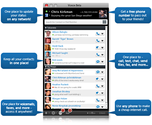 Voxox is een soort Skype plus. Behalve internet bellen kunt u er ook mee chatten, twitteren, Facebook gebruiken, bestanden verzenden, sms'en en zelfs mailen en faxen. De bedoeling is dan ook om al uw communicatie op één centrale plek te beheren.