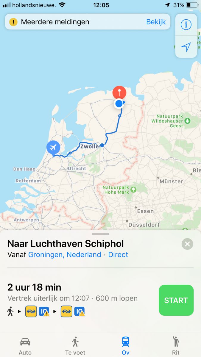 De standaard-aanwijzingen zijn voor auto maar je kunt ook kiezen voor wandelen, openbaar vervoer en taxi. Je kunt dus ook je OV-reis plannen in Apple Kaarten met alle benodigde trein- en bustijden (sinds eind 2018 ook in België).