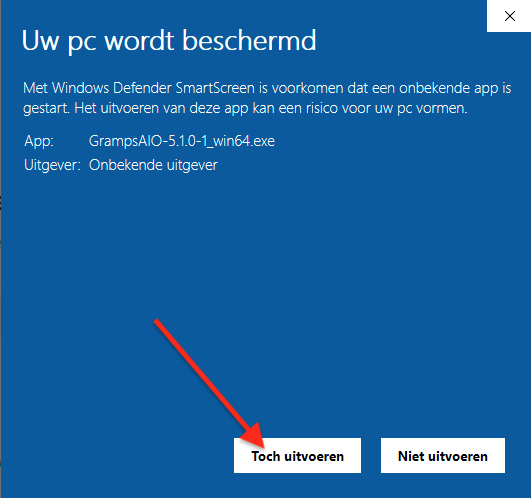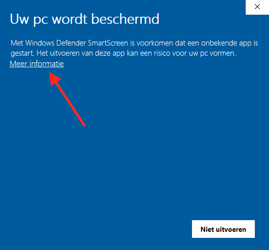 Als het gaat om de melding van Windows Defender smartscreen, klik dan op Meer informatie en Toch uitvoeren.