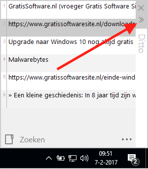Ditto kan tot 500 items onthouden. Je kunt Ditto openen vanuit de systeembalk naast de klok en daarna makkelijk bij de hand houden door op de >> te klikken (zie pijl in afbeelding).