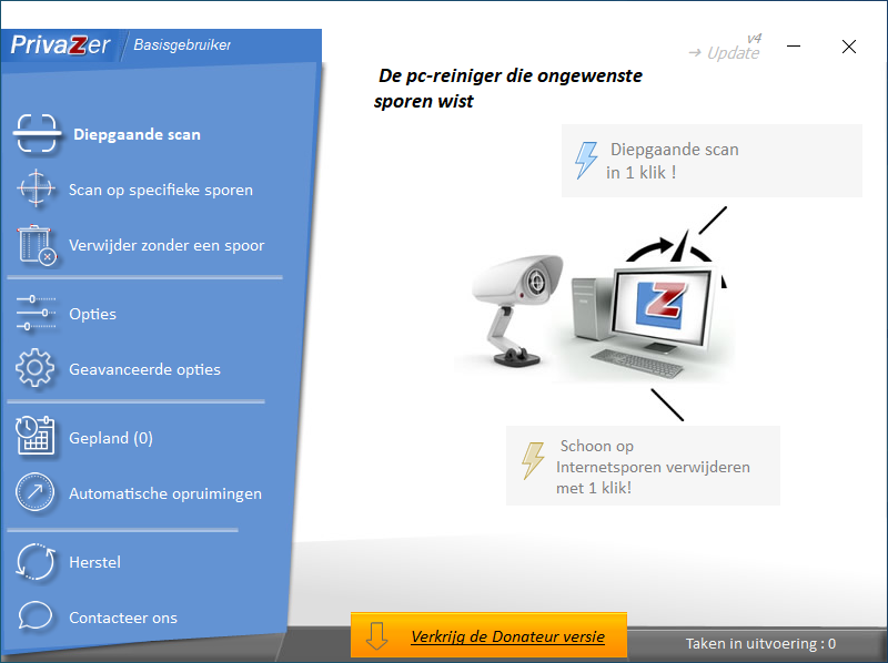 Je kunt met diverse soorten scans sporen van tientallen programma's (waaronder alle bekende browsers) opruimen. Je kunt ook bepaalde scans uitvinken als je ze te lang vindt duren. En als je een scan selecteert kun je onder opties ook nog heel veel instellen. Bij het opstarten heeft PrivaZer een handige wizard waar je kunt selecteren wat je wilt opschonen. Verder is er in het hoofdvenster een snelle 1-klik scan (Schoon op knop) om even al je internetsporen op te ruimen.