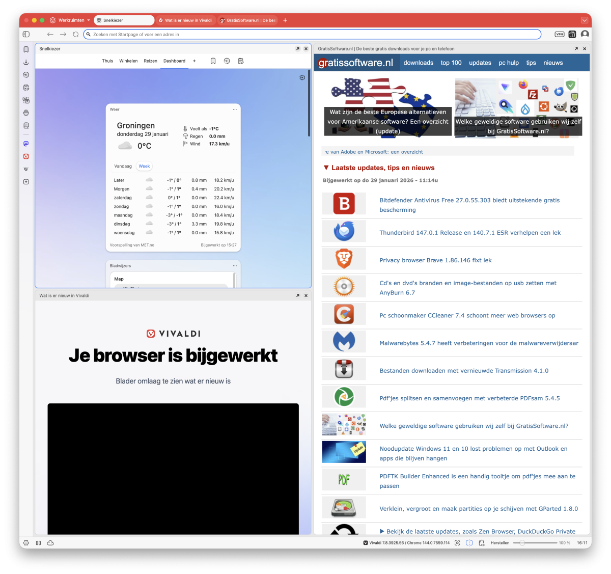 Vivaldi 7.8 is een grotere update voor de Noorse web browser, die is bijgewerkt naar de laatste Chromium 144 ESR. Daardoor worden diverse lekken gerepareerd.Verder heeft Vivaldi nieuwe functies, zoals een browserscherm dat je kunt opdelen in verschillende tegels. Sleep een tabblad naar een bepaalde plek in Vivaldi en laat het los. Zo kun je je browser-scherm opsplitsen met meerdere websites tegelijkertijd naast elkaar. Handig als je meer websites open wilt hebben en niet steeds wilt wisselen tussen tabbladen.