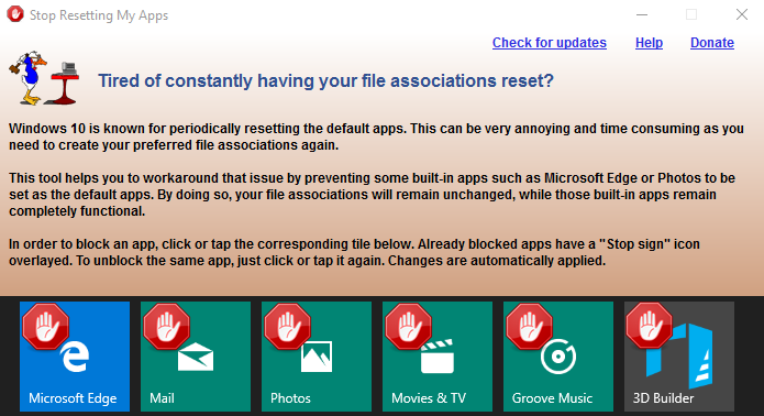 Stop Resetting My Apps is een klein, handig programmaatje dat deze bemoeizucht van Microsoft tegengaat. Het werkt heel simpel: je klikt op de apps van Microsoft die je NIET meer als standaard-app wilt terugkrijgen (en waarvoor je dus al zelf een ander programma geïnstalleerd hebt), waarna er een rood bord met een stop-hand verschijnt. Deze programma's van Microsoft worden nu in het vervolg geblokkeerd om standaard-app te worden. Je kunt ze wel gewoon blijven gebruiken trouwens.
