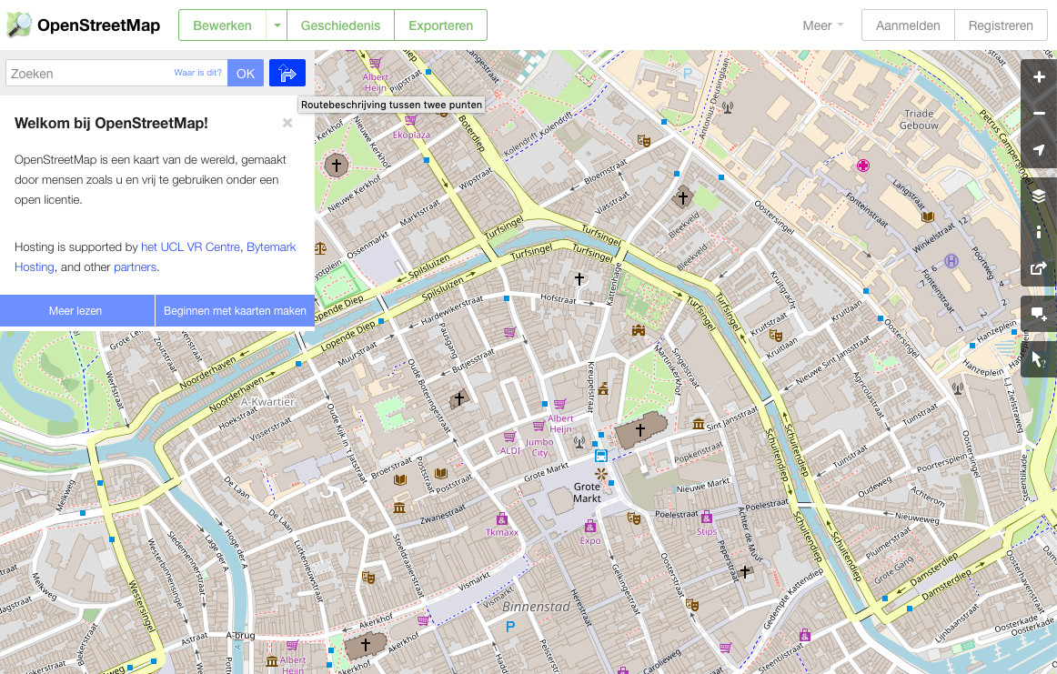 De website van OpenStreetMap biedt gedetailleerde kaarten. Je kunt linkboven een routebeschrijving opvragen als je je locatie en je bestemming invoert (klik op blauwe knop met twee pijltjes naast de zoekbalk). Daarbij kun je kiezen voor auto, fiets of wandelen als vervoermiddel.