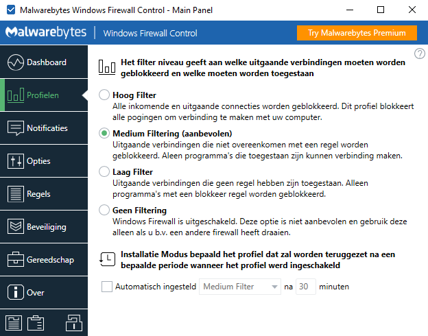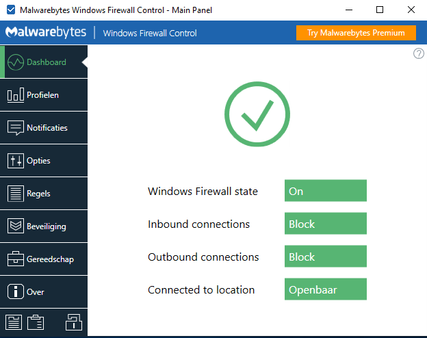 Windows Firewall Control gaat verder waar de ingebouwde Windows Firewall ophoudt: je kunt het uitgaande verkeer controleren en applicaties/toepassingen blokkeren of toestaan. Windows Firewall Control is een grafische schil voor Windows Firewall die na installatie in de systeembalk zetelt. In 2018 is Windows Firewall overgenomen door Malwarebytes en in 2019 is het hernoemd naar Malwarebytes Windows Firewall Control.