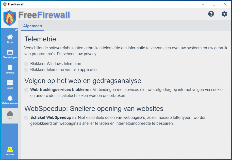 Mooi extraatje van Evorim Free Firewall is dat je Windows telemetrie en web tracking kunt blokkeren onder Tools.