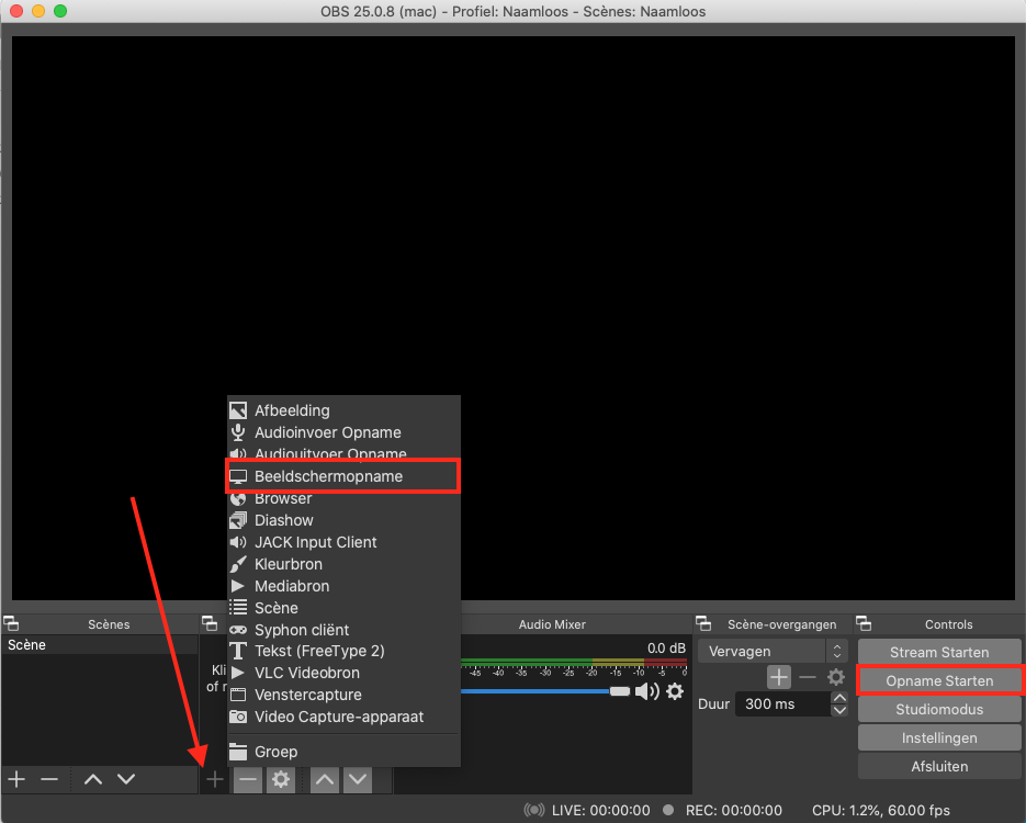 Voor het maken van schermopnamen (screen recordings) van de activiteiten op je pc of Mac kies je eerst de +-knop bij Bronnen en dan Schermopnamen en dan Opname starten. Zo kun je een filmpje maken van gebeurtenissen op je beeldscherm.