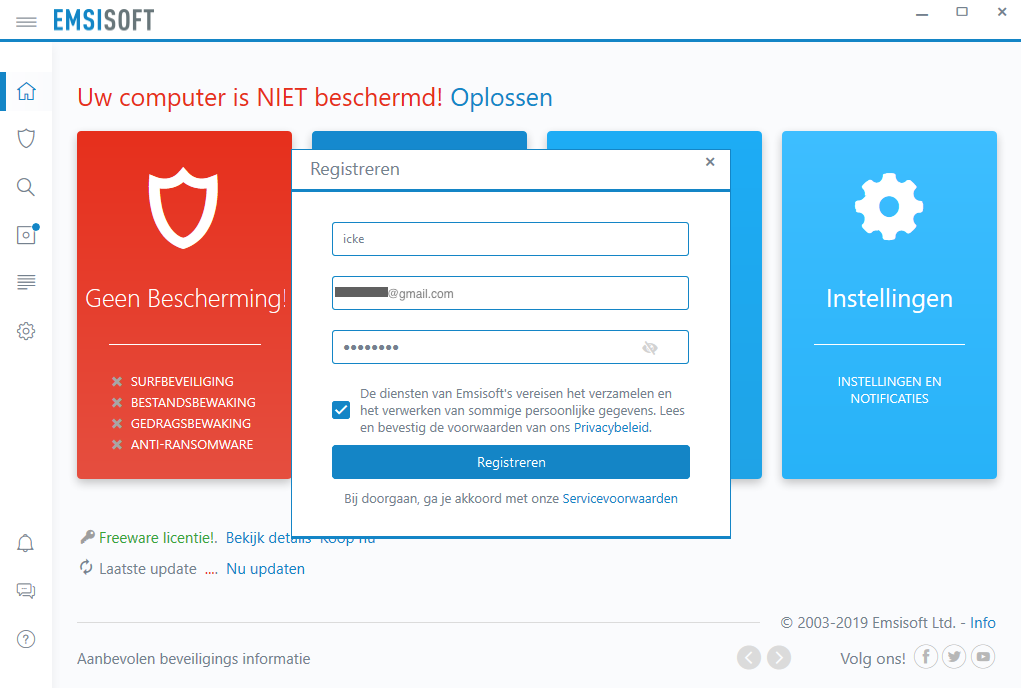 Sinds 2019 moet je gratis registreren bij Emsisoft om te kunnen inloggen in het programma en om de Cloud Console (webinterface om meerdere apparaten te beheren) te kunnen gebruiken.