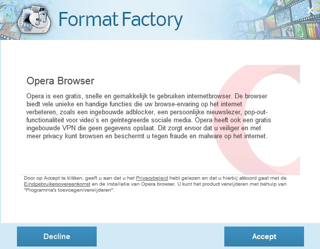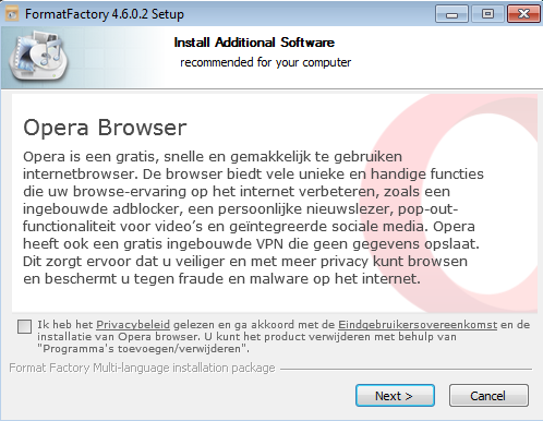 Helaas biedt FormatFactory tijdens de installatie veel onnodige extraatjes (PUP's en adware) aan, waardoor sommige virusscanners meldingen geven. Let dus goed op en haal de vinkjes weg bij onnodige software en/of werkbalken die worden aangeboden! Lees hieronder onze instructies bij de tabbladen Installatie en Scan.
