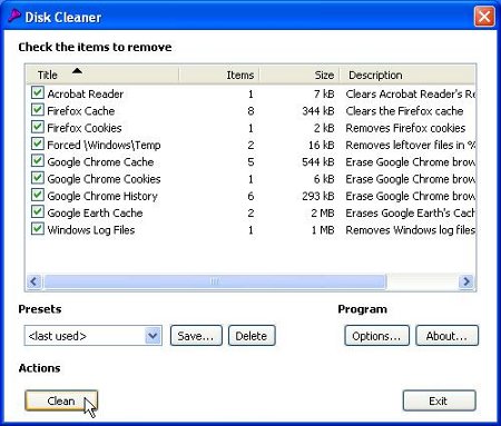 Disk Cleaner: vink de gevonden items aan en klik op Clean