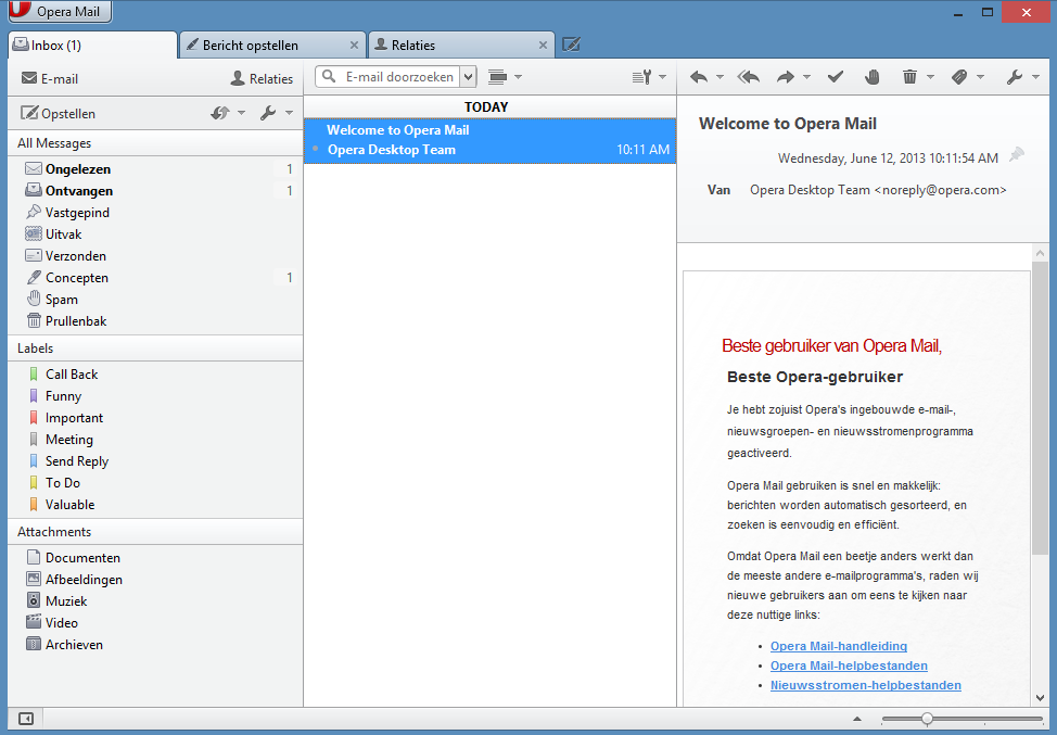 Opera Mail kan mail van POP-, IMAP- en webmail-accounts binnenhalen. Mail uit bestaande mailprogramma's als Outlook Express, Thunderbird en meer kun je automatisch importeren. Opera Mail beschikt over alle eigenschappen van een klassieke mailclient: