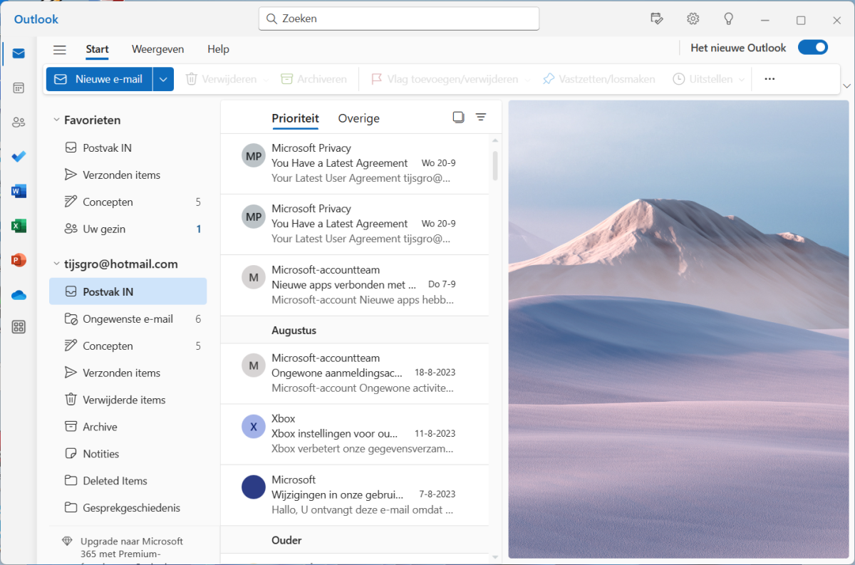 In de Mail en Agenda app in Windows 10 en 11 kun je trouwens op de knop rechtsboven klikken om Het nieuwe Outlook aan te zetten.