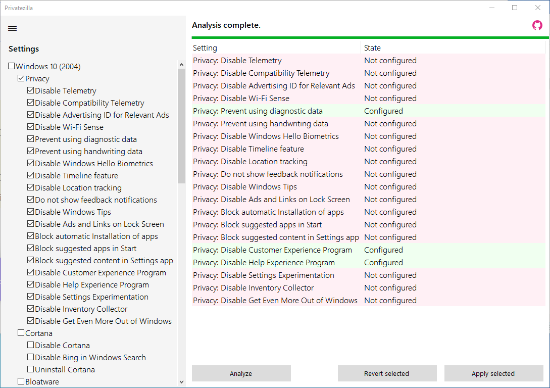 Privatezilla (voorheen SpyDish) is een open source tooltje om de privacy-instellingen van Windows 10 aan te passen. Met Privatezilla kun je snel telemetrie, app aanbevelingen en andere dataverzameling door Microsoft uitschakelen. Privatezilla verbetert verder je privacy door bijvoorbeeld locatie tracking en gepersonaliseerde ads uit te zetten. Voor gevorderden!