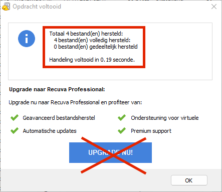 Let op dat je NIET hoeft te upgraden om bestanden te herstellen. Als je dit venster ziet zijn je bestanden al hersteld!