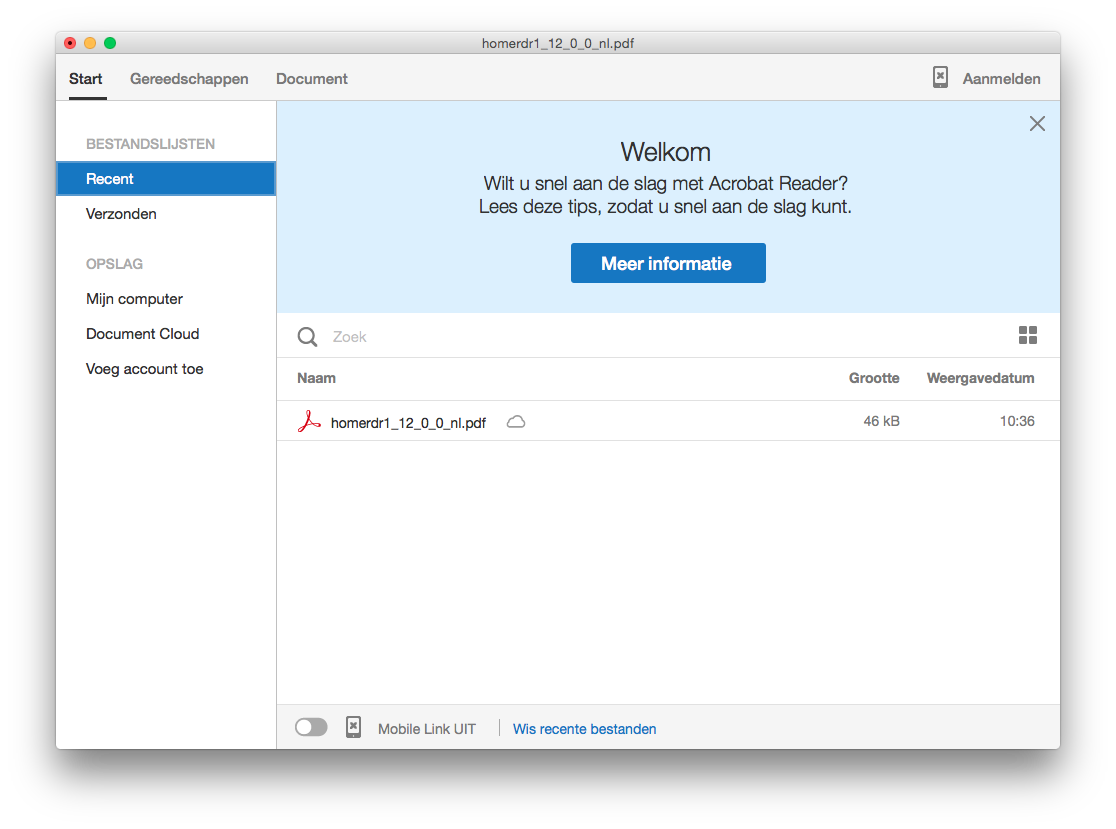 Start is de plek waar je documenten uit de Adobe Cloud, van je pc (of uit Sharepoint voor zakelijke gebruikers) kunt openen.
