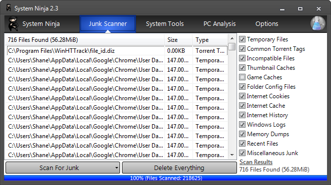 System Ninja is een snelle pc schoonmaker van de producent van CCEnhancer en JavaRa (om respectievelijk CCleaner mee uit te breiden en oude Java-installaties mee op te ruimen). System Ninja ruimt tijdelijke bestanden, sporen van je internet browsers en andere rommel op. Ook kan System Ninja opstartende programma's en actieve processen beheren.