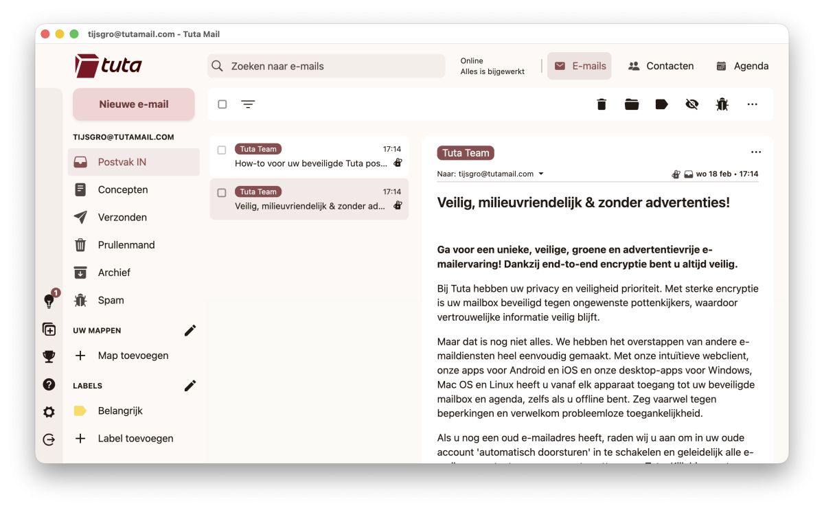 Tuta Mail is een groene mailaanbieder die ook zijn eigen open source desktop en mobiele apps heeft. Tuta Mail doet niet aan tracking en advertenties en de mail is zeer goed beveiligd voor je privacy. Naast Tuta Mail kun je ook Tuta Calendar gebruiken.
