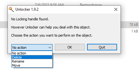 Daarna kun je bij No actions (afhankelijk van of er een locking handle gevonden is) voor Delete (Verwijderen) kiezen.