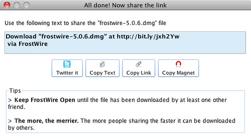 FrostWire is gebaseerd op LimeWire en is te downloaden voor Windows, Mac OS X, Linux en Android. Het programma is ook in het Nederlands vertaald. Let goed op bij de installatie en haal het vinkje weg bij de Ask werkbalk voor Internet Explorer en Firefox als gevraagd wordt of u deze onnodige toolbar wilt installeren.