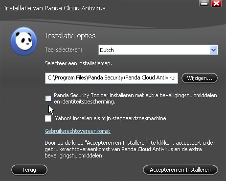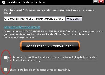 Let op dat je bij de installatie niet je zoekmachine en startpagina laat wijzigen. Ook de Panda werkbalk voor je browser is niet nodig. Haal de vinkjes weg!