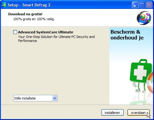 2. Na de installatie wordt je ook nog gevraagd of je Advanced SystemCare Ultimate wilt installeren. Dit is een betaalde versie die je waarschijnlijk ook niet wilt. Haal hier het vinkje weg en kies voor overslaan.
