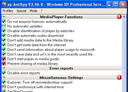 Dit varieert van het stopzetten van een aantal Windows-services 'die naar huis bellen' (zoals de fouten-rapportage), het wijzigen van privacy-instellingen van de Windows Mediaspeler tot het aan- en uitzetten van beveiligingsfuncties in Internet Explorer, zoals JavaScript, ActiveX, pop-up blokkeerder, phishing filter en het verwijderen van de cache.