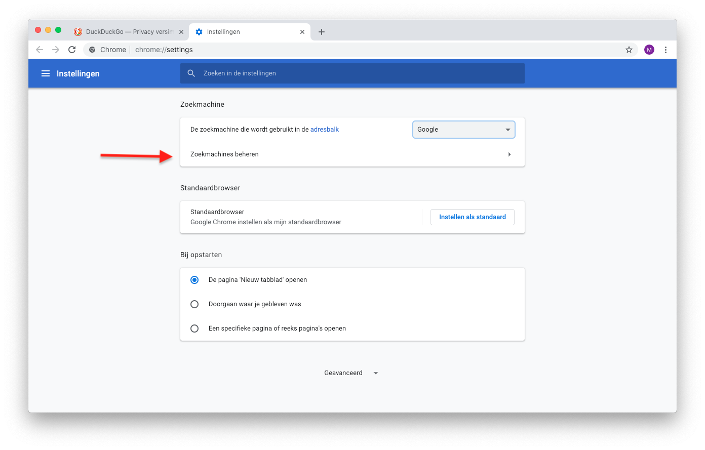 2. Kies bij Zoekmachine voor DuckDuckGo