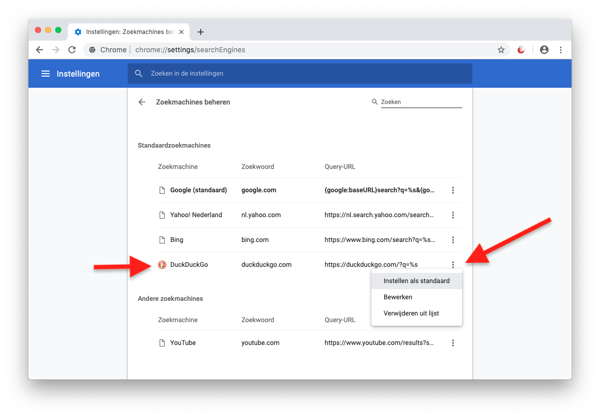 A. Stel DuckDuckGo in als zoekmachine in Chrome