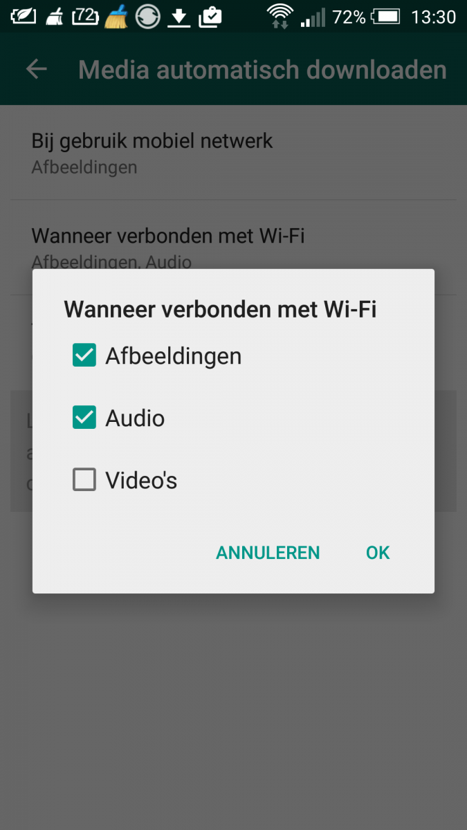 Ga in WhatsApp naar Instellingen | Chatinstellingen | Media automatisch downloaden en klik op Wanneer verbonden met Wi-Fi en zonodig Bij gebruik mobiel netwerk en haal het vinkje weg bij Video's.
