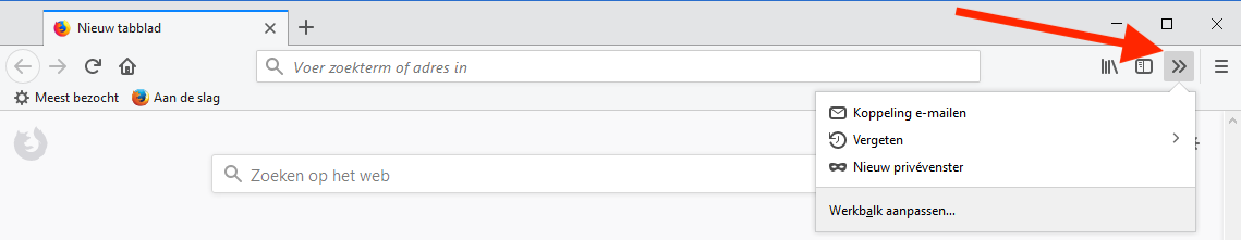 Je kunt via Rechtsklikken op de werkbalk | Aanpassen (of via het driestreepjesmenu) ook de knoppen op de werkbalk wijzigen. Sleep de gewenste knoppen naar de werkbalk (links of rechts van de adresbalk) en klik Gereed. Je kunt ook knoppen naar het 'Overloopmenu' (vierkante blok rechts) slepen: deze worden dan zichtbaar als je op de >> in de werkbalk klikt.