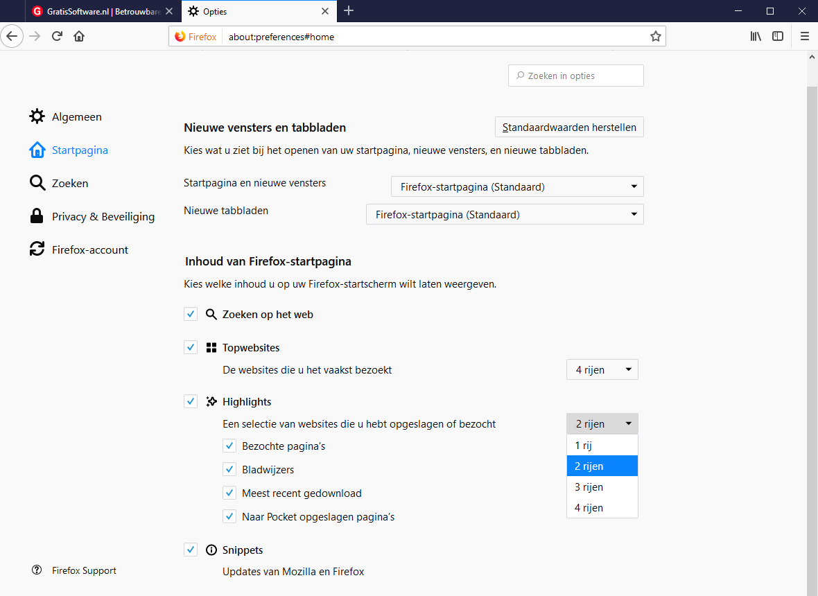 Ook zitten in Firefox 62 meer mogelijkheden om secties op je startpagina en nieuw-tabblad-pagina te beheren. Zo kun je in de instellingen bij Startpagina kiezen voor een tot vier rijen met sites bij Topwebsites en Highlights.