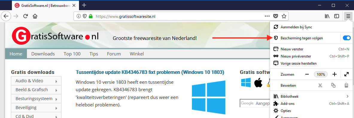In het hamburger-menu (drie streepjes rechtsboven) zit een nieuwe knop waarmee je tracking protection ofwel bescherming tegen volgen door websites makkelijk aan en uit kan zetten. Zo kun je de bescherming snel aan- of uitzetten (als een website daardoor niet werkt bijvoorbeeld).