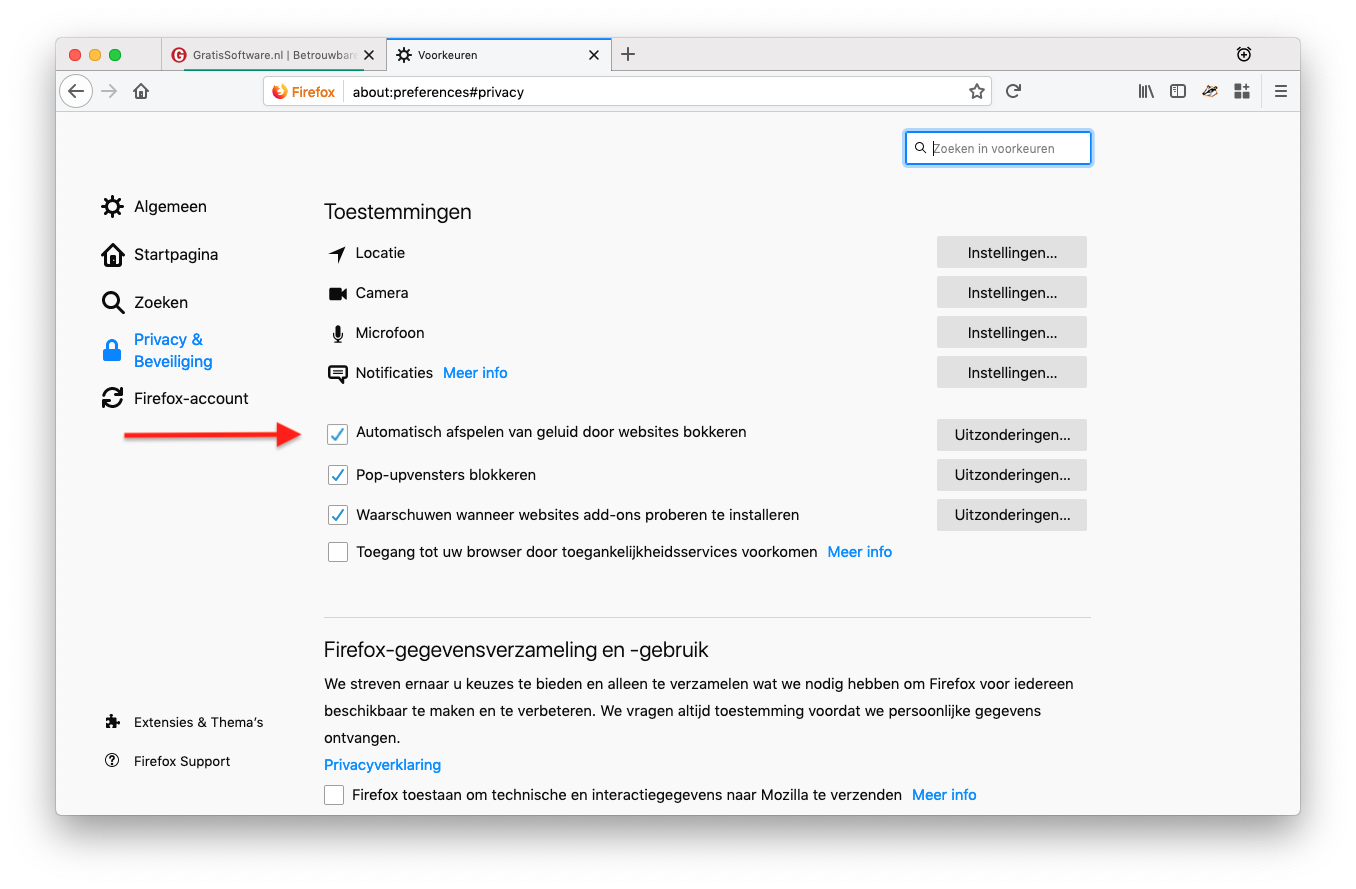 Vreemd, bij mij zit deze optie onder bewerken, voorkeuren en dan links privacy & beveiliging en dan naar beneden scrollen.