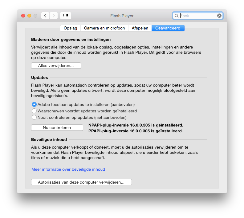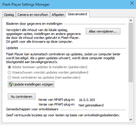 Je kunt hier ook de versienummers van Flash controleren. Al naar gelang welke web browsers je geïnstalleerd hebt, kun je zien staan: