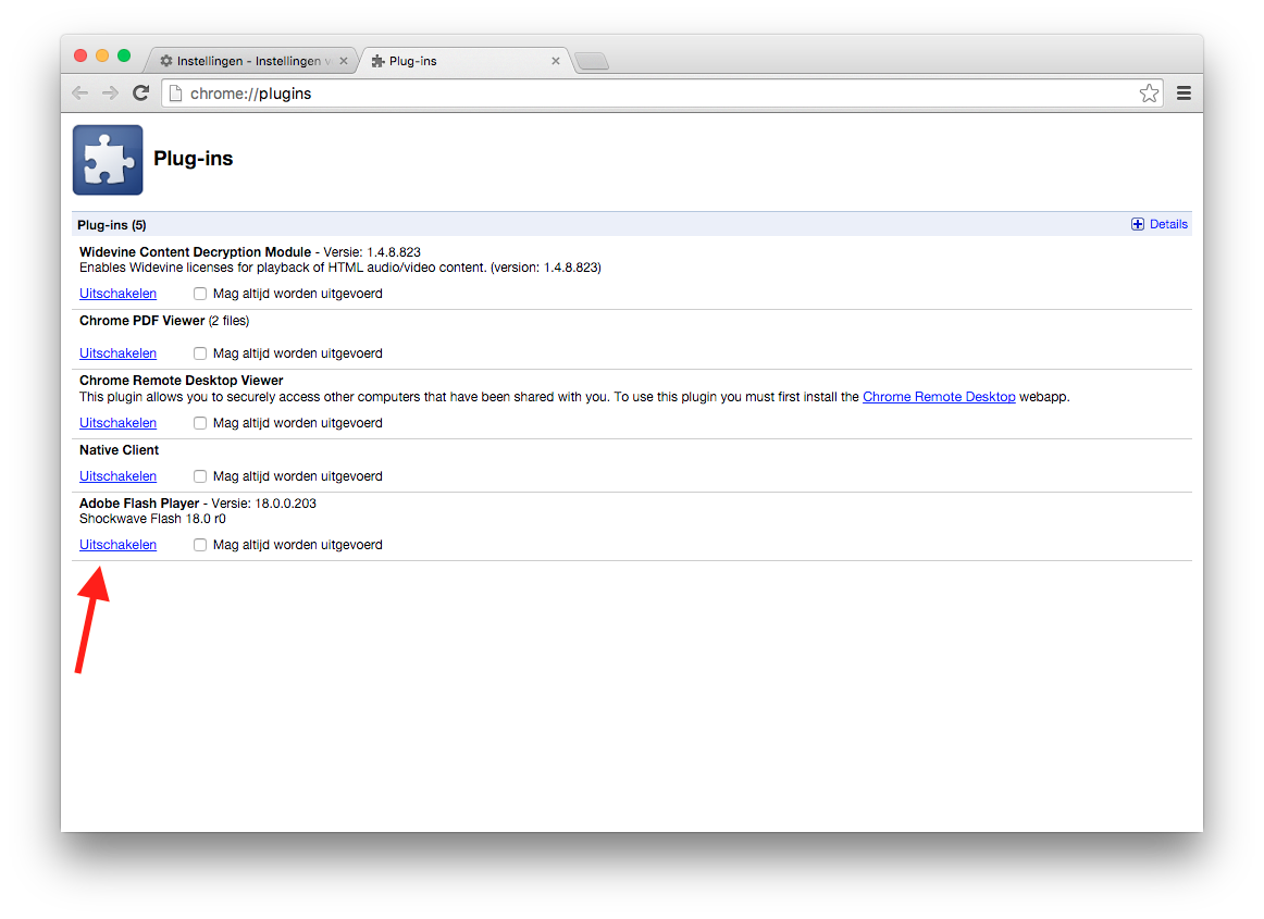 Als je nog klikt op Afzonderlijke plugins beheren kun je ervoor kiezen om afzonderlijke plugins uit te schakelen. (Of typ chrome://plugins in de adresbalk).