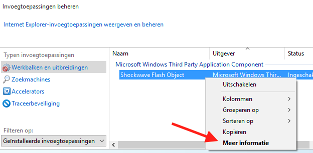 Je kunt ook plugins op click-to-play zetten in Internet Explorer. Klik rechts op de gewenste plugin en kies Meer informatie. Daarna klik je op de knop Alle websites verwijderen waarmee je toestemming van de plugin intrekt om uitgevoerd te worden op websites.