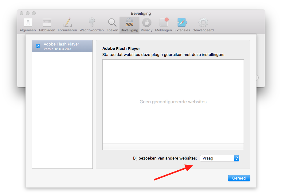 Ga naar menu Safari | Voorkeuren | Beveiliging en klik onderaan op de knop Plugin-instellingen. Zet vervolgens de plugin op Vraag achter Bezoeken aan andere websites.